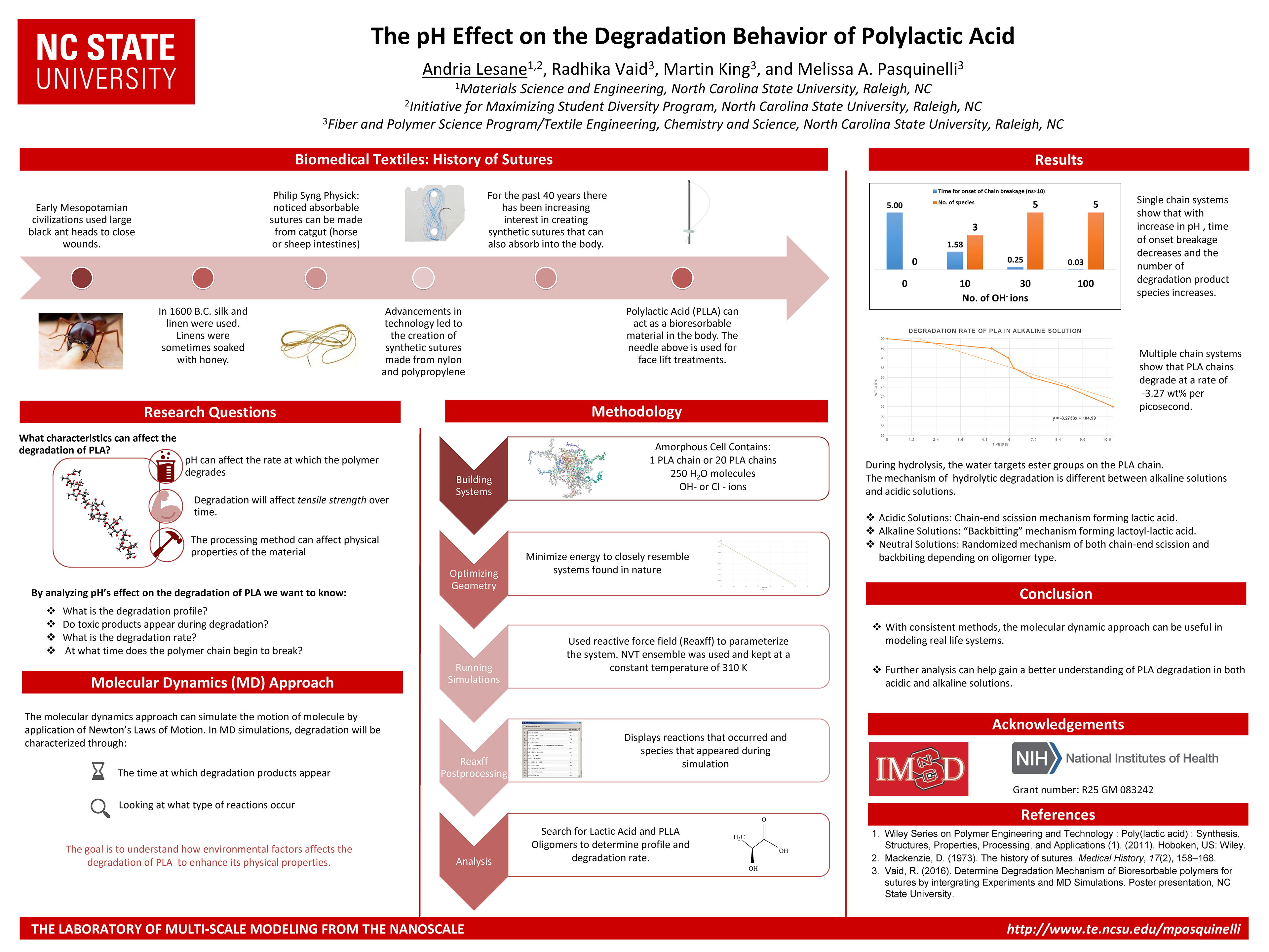 TL;DR This project used molecular dynamics simulations to investigate how pH influences the hydrolytic degradation behavior of polylactic acid (PLA), revealing distinct degradation mechanisms in acidic, alkaline, and neutral environments. The work demonstrated that higher pH accelerates chain breakage and increases degradation species, confirming MD as a consistent and effective tool for modeling polymer degradation.